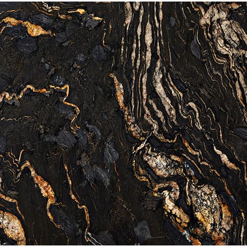Depero has a deep black background, boldly displaying gold veining patterns. This stone is a striking and distinctive choice.